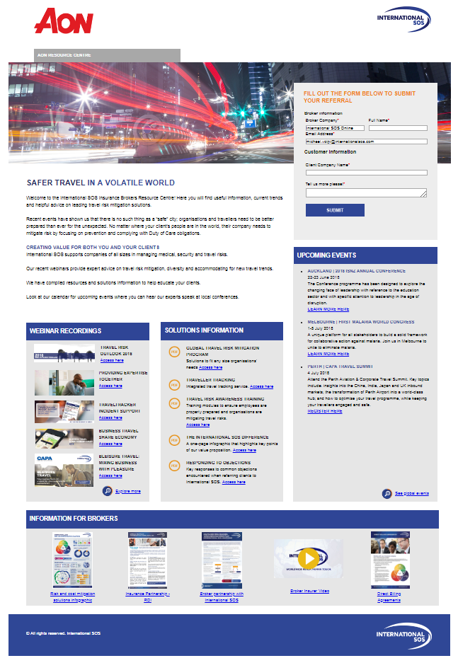 | To better educate your TMC and Insurance Broker contacts, your Marketing and Insurance partnerships teams developed co-branded resource centres for our key partners in the region. They are for external distribution and showcase TMCs and Insurance Brokers-specific marketing materials, up-coming events, webinar recordings and solutions information for them to create value for both themselves ans their clients. Equally importantly, we have added an online referral form for them that, once filled out, triggers an alert to our Partnerships Director who will liaise back with you to follow up. Resource Centres for you to share with your TMC and Insurance Broker contacts: Click on each link to be redirected to the page TMC RESOURCE CENTRES INSURANCE BROKER RESOURCE CENTRES |